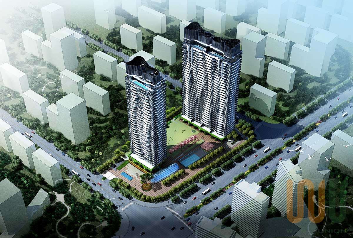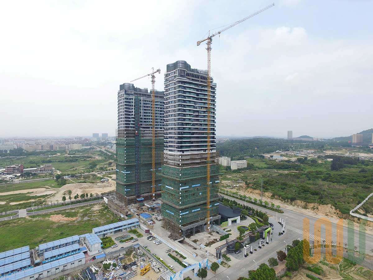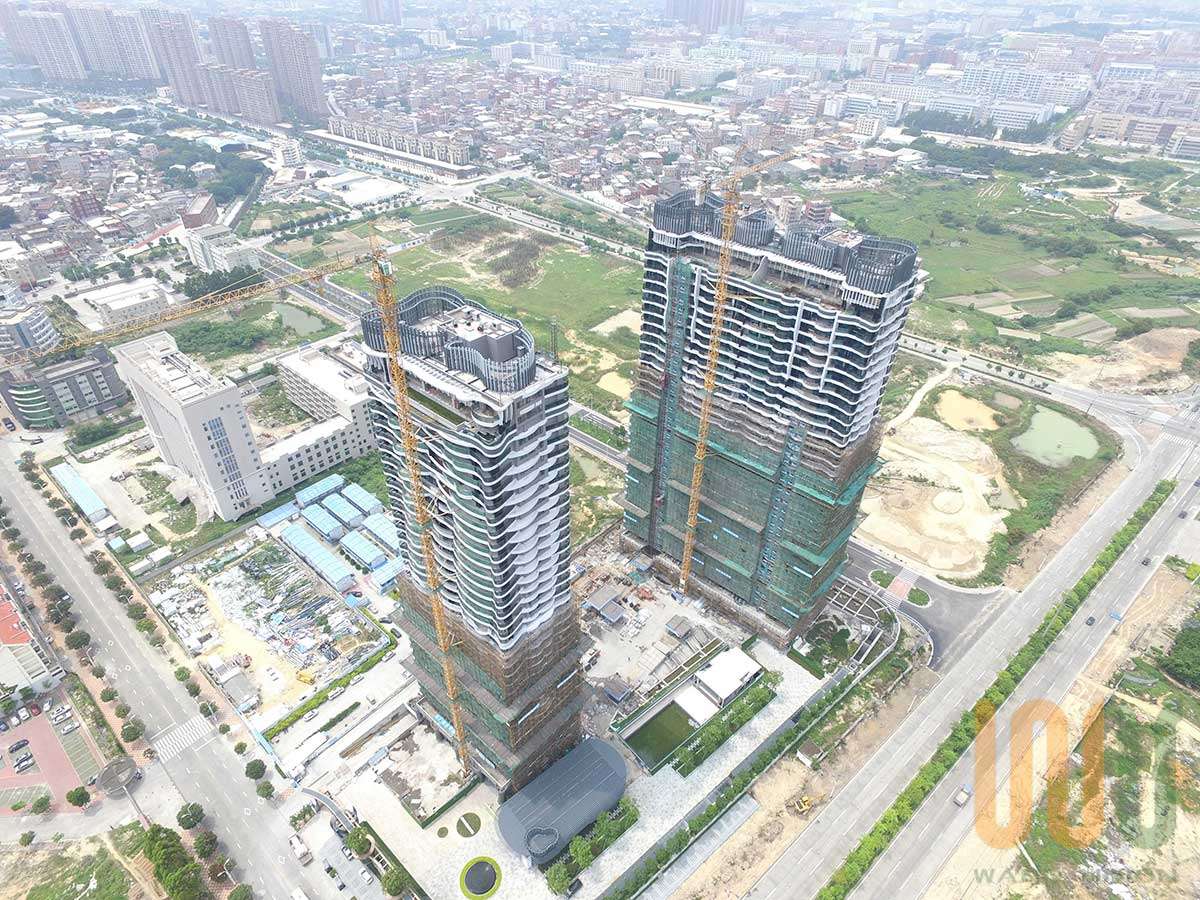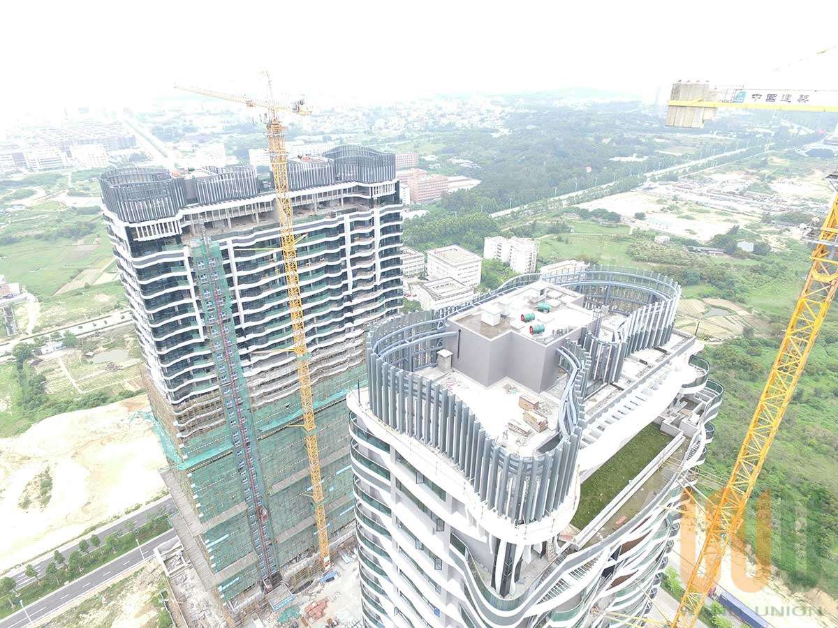 建筑形體取材于業主及石獅市的紡織形象,加以流線動態的先進時尚造型,使本項目在石獅市內創造了令人印象深刻的地標性建筑。同時亦藉由因本項目主樓上部結構外弧線造型板,每層結構外造型尺寸、位置均不相同,且造型板采用下沉式做法,最大造型板外挑2960mm,為指導現場施工,各層平面圖畫出250的網格圖,按照網格圖定位每個造型板的弧線位置,然后以此尺寸現場模板上彈出網格線,確認造型板外側模板位置,組織施工。