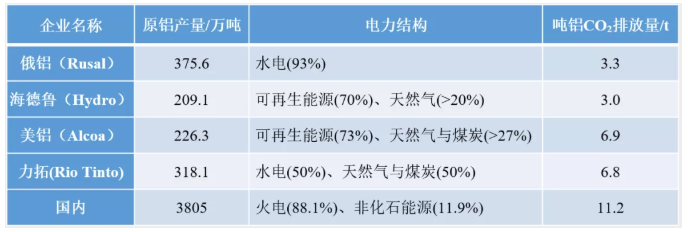 表1 2020年國外主流鋁企業(yè)能源結(jié)構(gòu)對比
