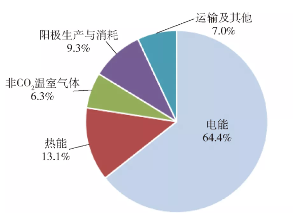 原鋁生產(chǎn)中,能源消耗排放的CO2占比較大,達到77.5%(其中,電能消耗排放的CO2量約占64.3%,熱能消耗排放的CO2量占比13.1%)。