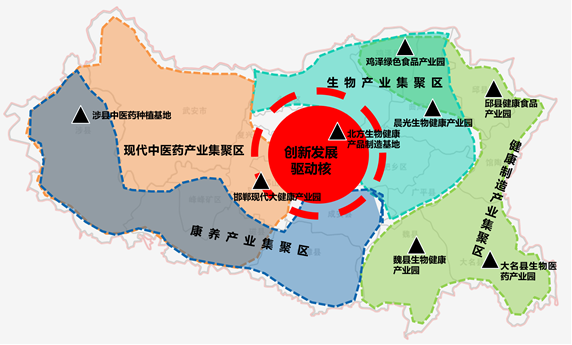 邯鄲市是北京疏解非首都功能的拓展區,河北省高質量發展的南大門,要充分發揮邯鄲市獨特的區位和綜合交通優勢,積極融入“一帶一路”倡議、京津冀協同發展、中原經濟區等國家發展戰略,推進邯鄲市生物健康產業創新、集聚、綠色、循環、高端發展,努力打造兩中心(世界生物提取物研發生產中心、晉冀魯豫交界區域醫療衛生服務中心)、兩區(河北省現代中藥產業發展集聚區、河北省生物健康產業創新發展引領區),構建現代產業體系。