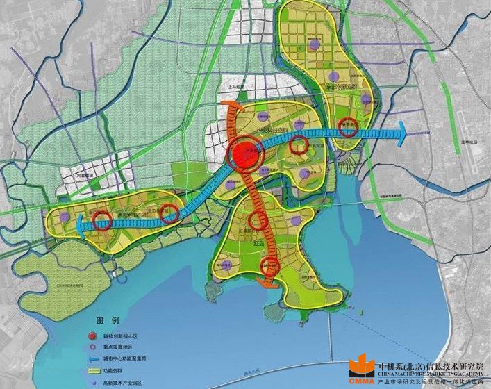 在膠州灣北部園區建設科技創新島群,形成“十”字形的城市中心功能聚集帶。