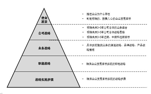 其次,依據(jù)自身和行業(yè)的分析結(jié)論,中機院對其企業(yè)使命、愿景進行推倒和論證,得出要做第二個百麗集團的愿景。之后,從營銷、產(chǎn)品、渠道、組織架構(gòu)、品牌、人力資源等方面根據(jù)其愿景和使命進行戰(zhàn)略規(guī)劃。在此過程中,我院運用了多種管理咨詢工具,如波特五力分析模型,SCP分析模型,SWOT分析矩陣,PESTEL大環(huán)境分析,波士頓矩陣,分析平衡計分,產(chǎn)品生命周期分析,價值鏈咨詢模型等。