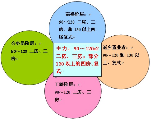 經過調研與研究,確定產品走中檔偏高的路線,而作為一個中高檔樓盤,它所面對的客戶群也必然是有選擇性的。由消費群金字塔的結構也可以看出,中高檔消費群數量并不為多,但要求并不為低,可以說對于“質”與“價”的平衡與協調,他們是幾類消費群體中最頭痛的族群。介于本項目為大盤屬性,市場客戶定位方面應盡可能擴大客源,故此,客源基本上以中等,中高等階層客戶為主,一網打盡式客戶定位。