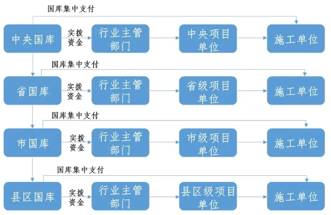 中央預算內投資計劃下達后,由財政部逐級下發資金額度,根據項目申報的主體層級不同,由相應層級的財政部門以實撥資金或國庫集中支付方式撥付至項目實施主體或施工單位。中央預算內直接投資項目,主要以國庫集中支付方式,由相應層級國庫根據撥付指令將資金直接撥付至施工單位;中央預算內投資補助和貸款貼息項目,主要以實撥資金方式,由相應層級國庫撥付至項目實施主體;中央預算內投資資本金注入項目,資金撥付主要為實撥資金,由相應層級的國庫撥付至項目實施主體賬戶中。